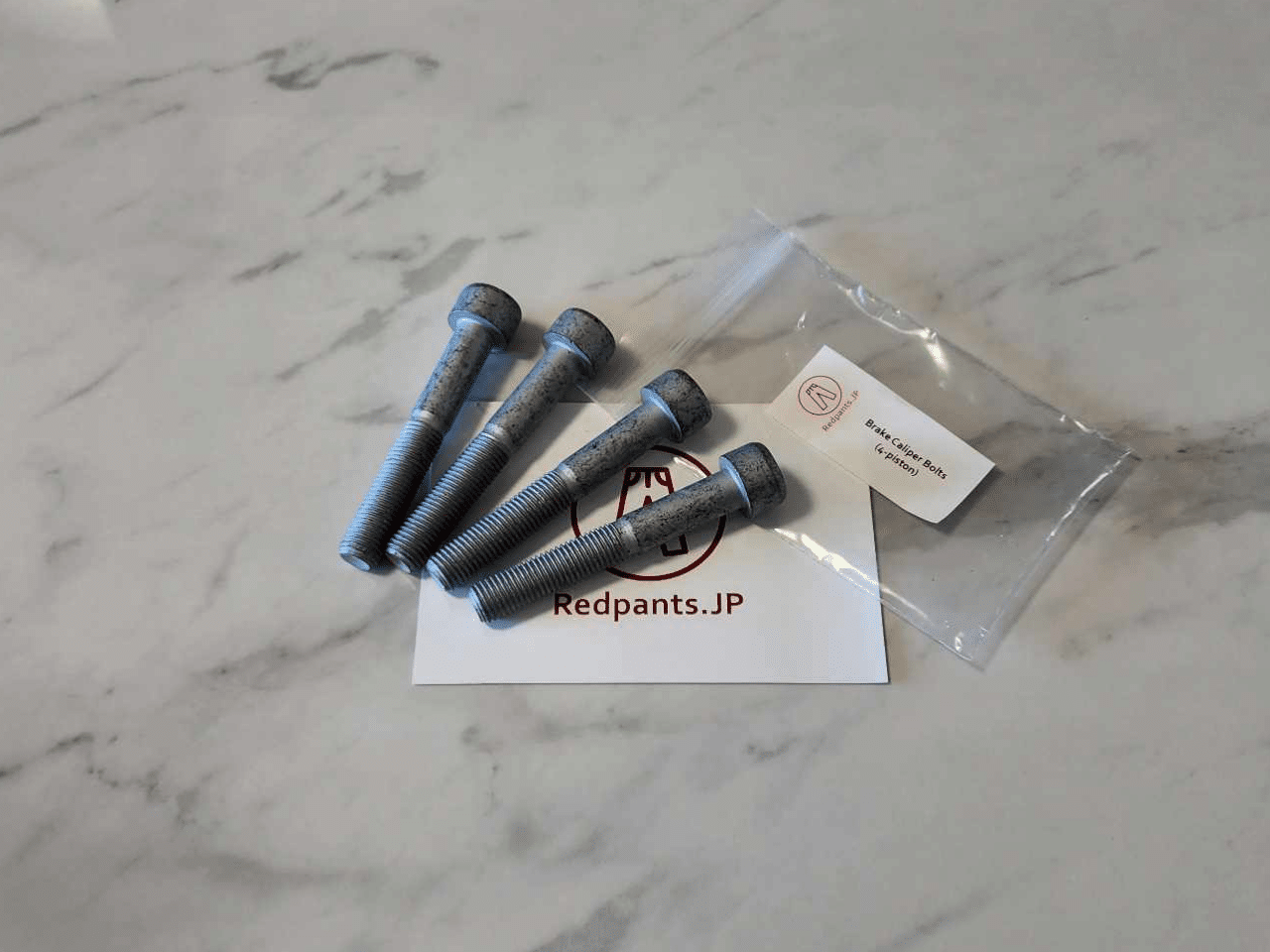 The bolts used to mount your brake calipers should be replaced with new ones if you remove your calipers. These are the bolts for 4-piston brake calipers with iron brake rotors (not CCM/Carbon brake rotors). The bolts used for the 6-piston calipers and for carbon-rotor brake systems are slightly different.