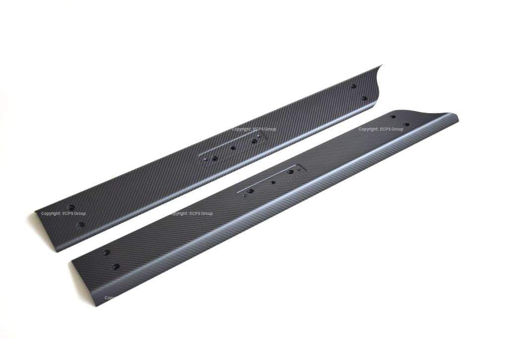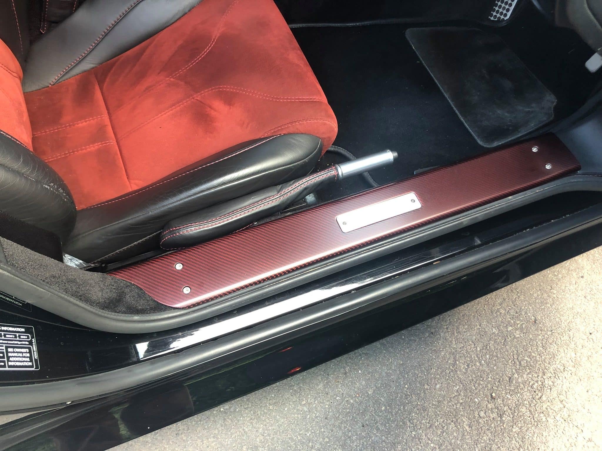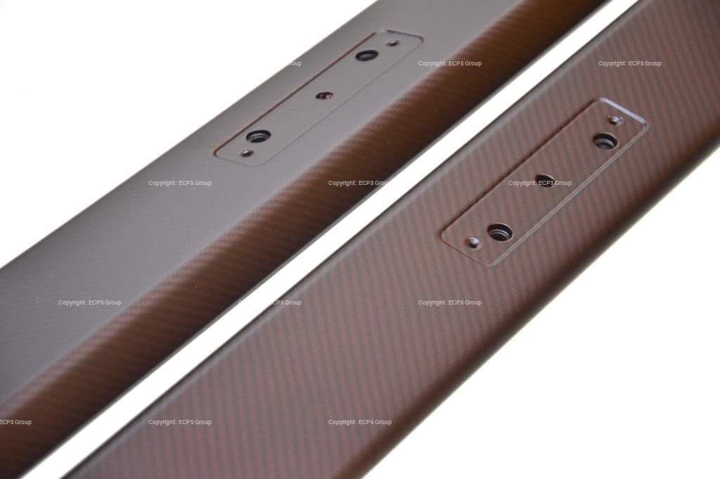 All of these scuff plates are the same style, but designed to fit each car. So, if you have a DB9 with the grooved aluminum sill and embedded leather pad, the ECPS version will eliminate the grooves and pad. Instead, it’ll be a smooth carbon fiber as seen in the product pictures.