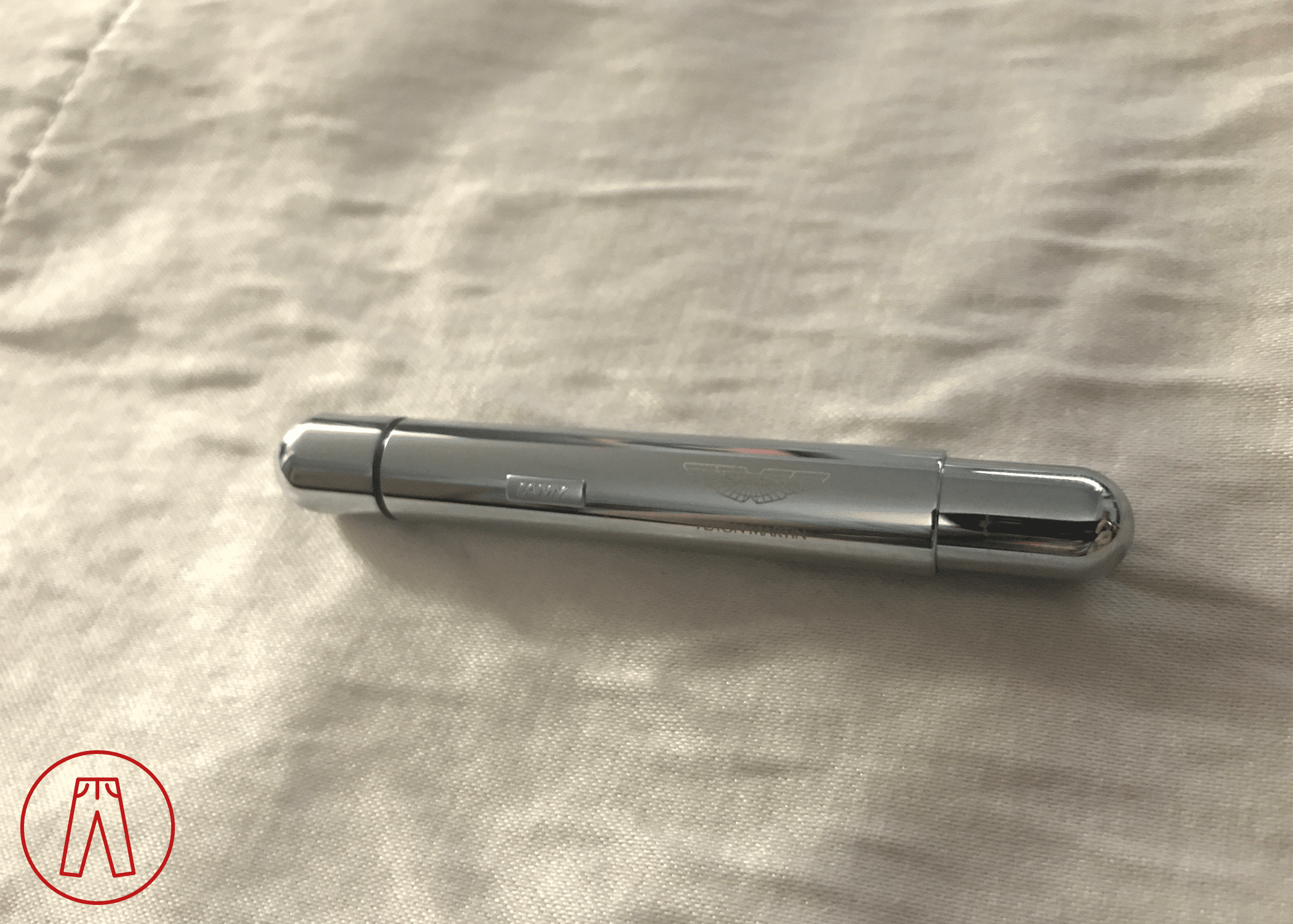 This is an OEM item from Aston Martin. It is a short pen with a chrome finish and has the Aston Martin logo etched into it.
